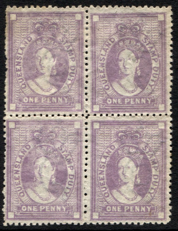 STAMP DUTY 1d mauve block of 4, Unused (no gum).
