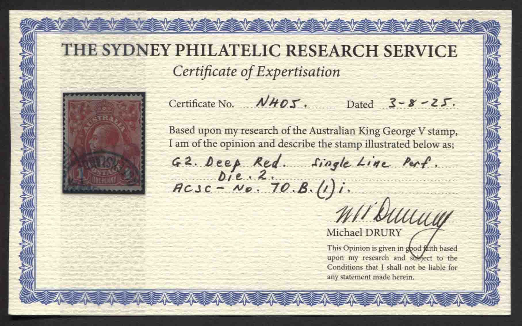 Single wmk, smooth paper SINGLE LINE PERF, 1d DEEP RED, die 2 (G2). DRURY Certificate. A VERY RARE combination. Fine used.