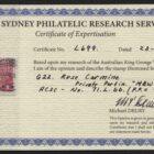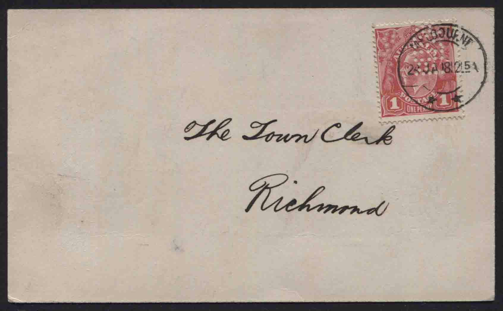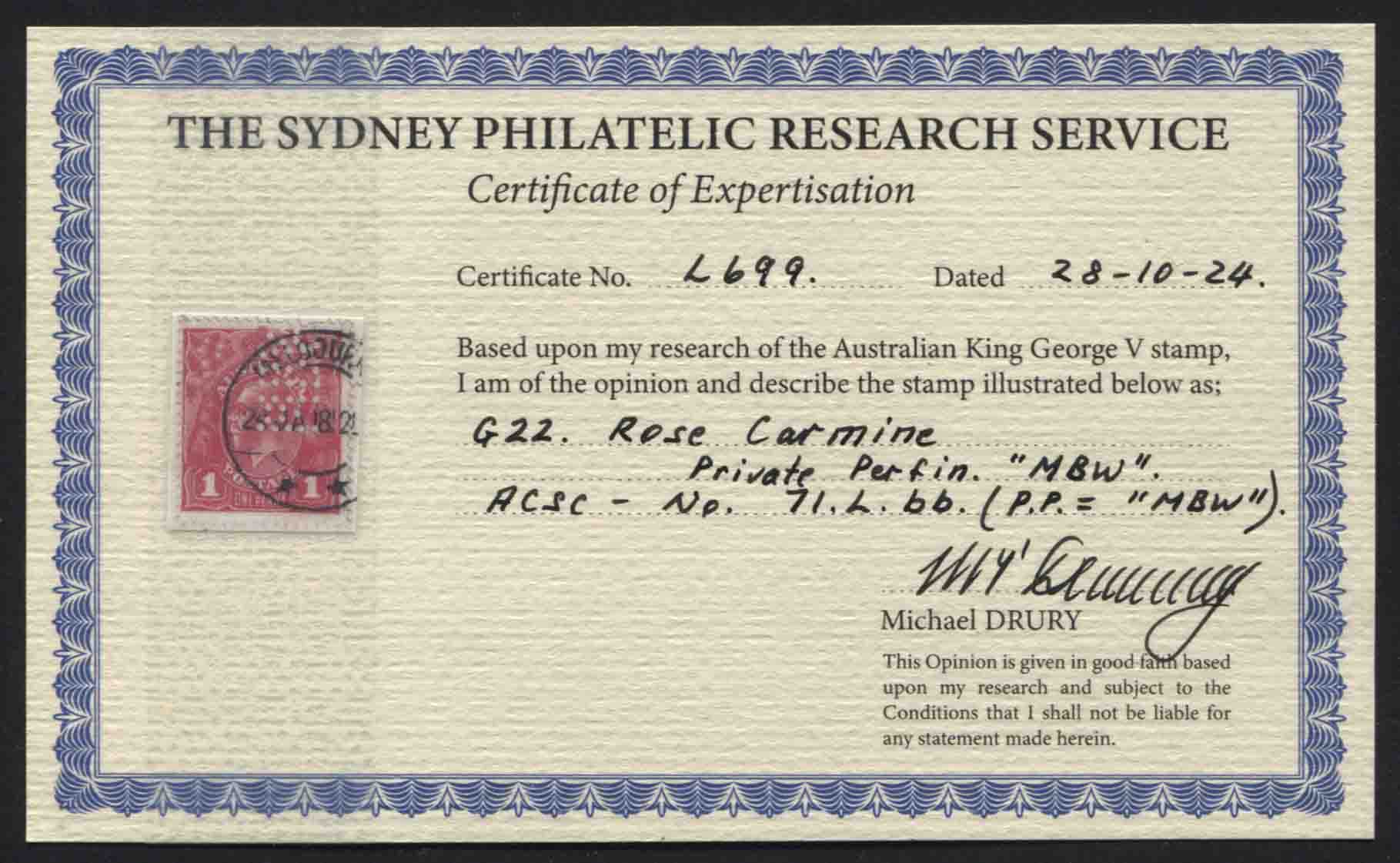 Single wmk, smooth paper. 1d ROSE-CARMINE (G22), private perfin “MBW” on reply card. Drury Certificate. Very fine.