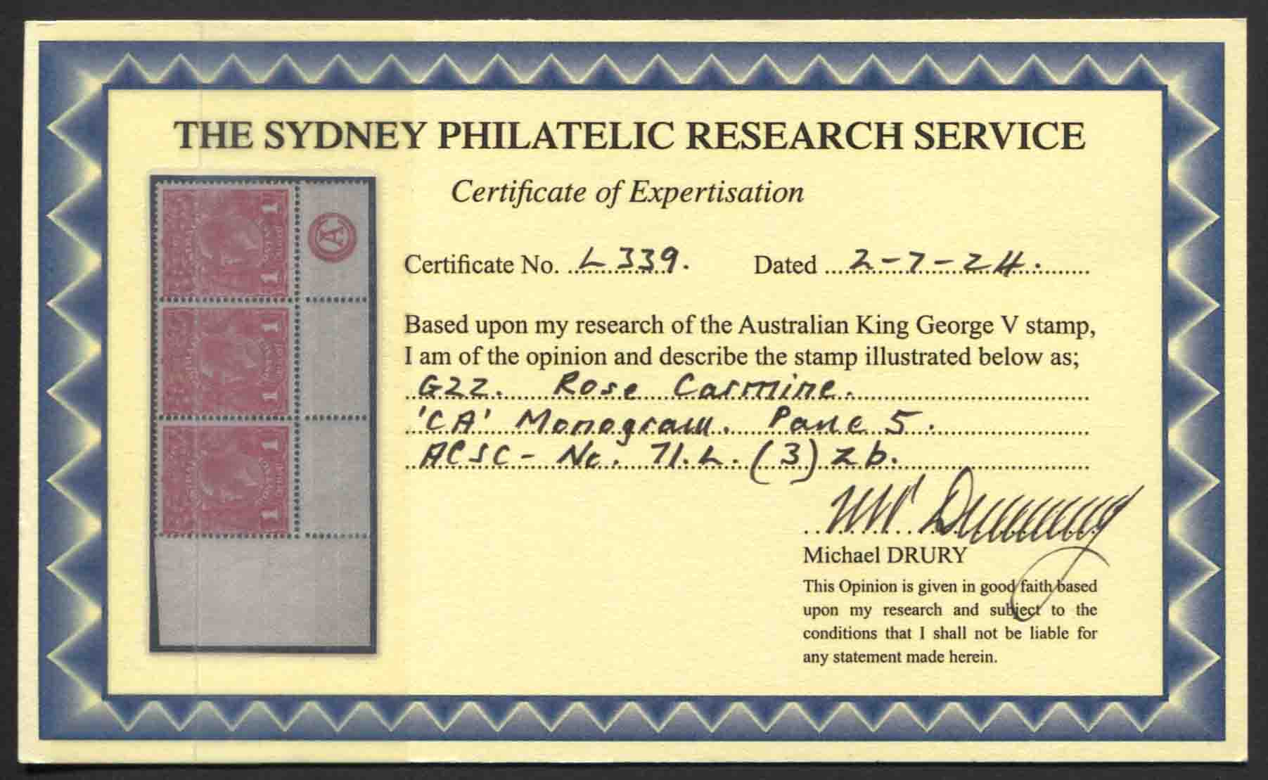 Single wmk, smooth paper. 1d ROSE CARMINE (G22), CA monogram corner strip of 3. DRURY Certificate. Monogram stamp is mint unhinged, others are mint lightly hinged. Very fine.