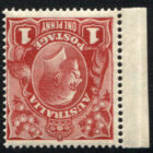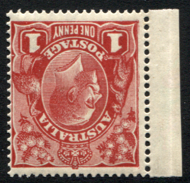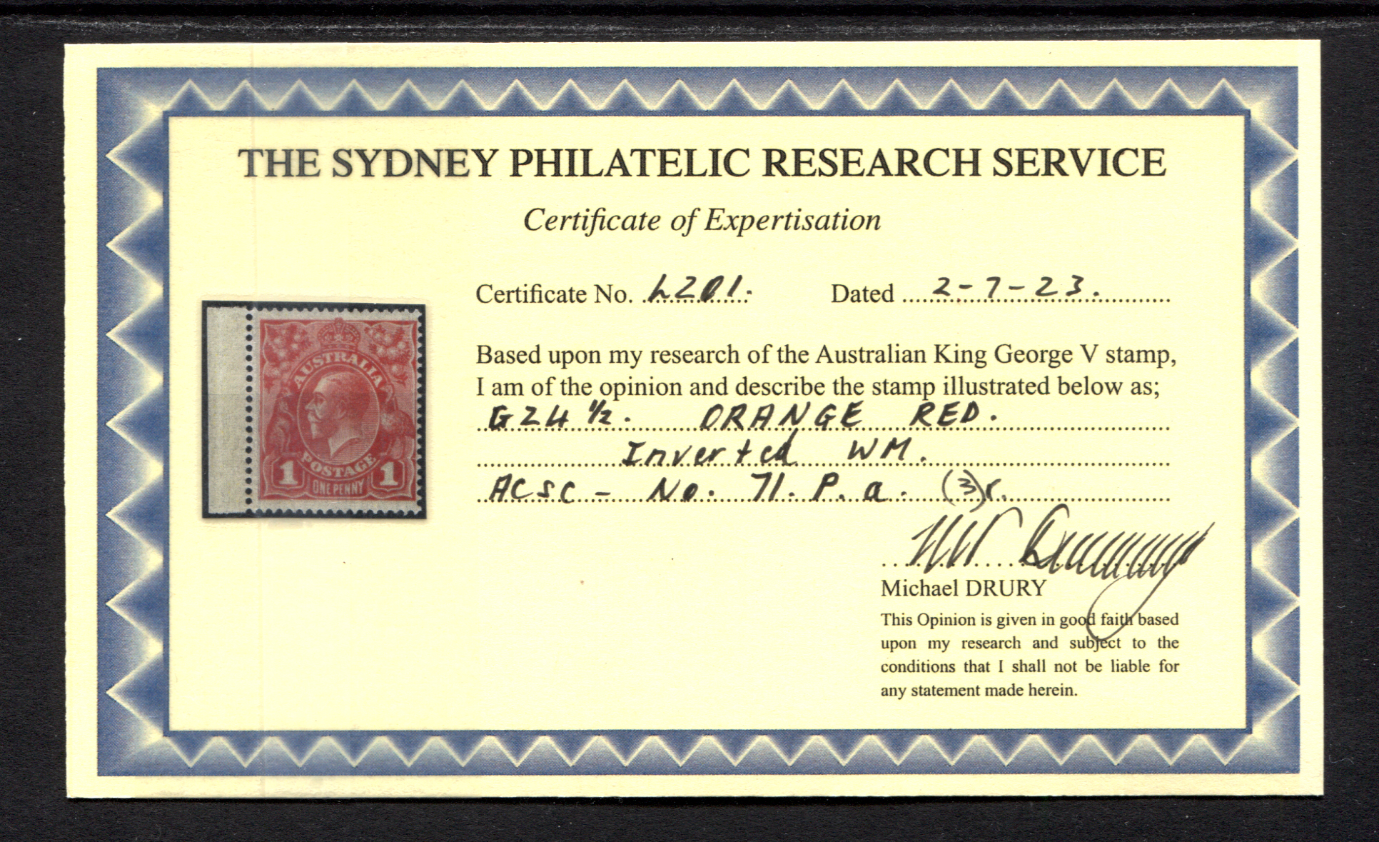 Single wmk, smooth paper. 1d orange – red (G24½). DRURY CERTIFICATE. Wmk INVERTED and WHITE LINE to right of EMU’S FEET. Mint unhinged (gum bursts on reverse).