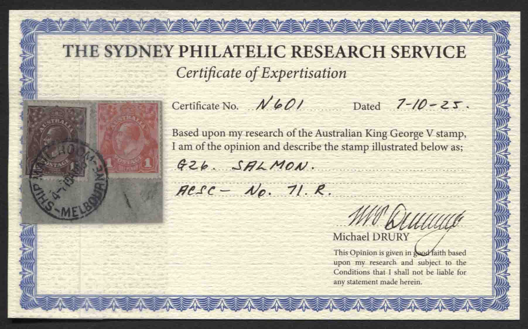 Single wmk, smooth paper. 1d SALMON (G26) on cover. DRURY CERTIFICATE. Very fresh.