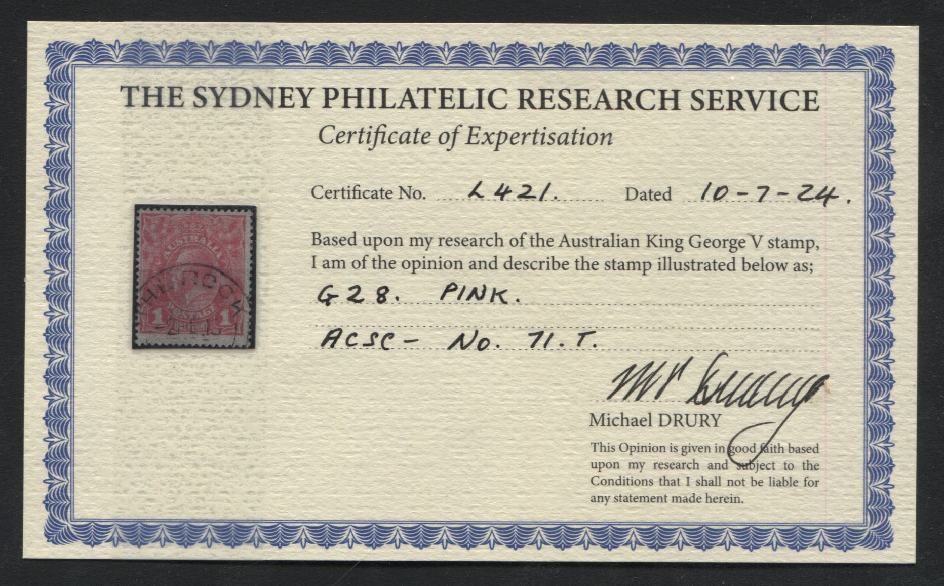 Single wmk, smooth paper. 1d PINK (G28). Drury Certificate. Fine used.