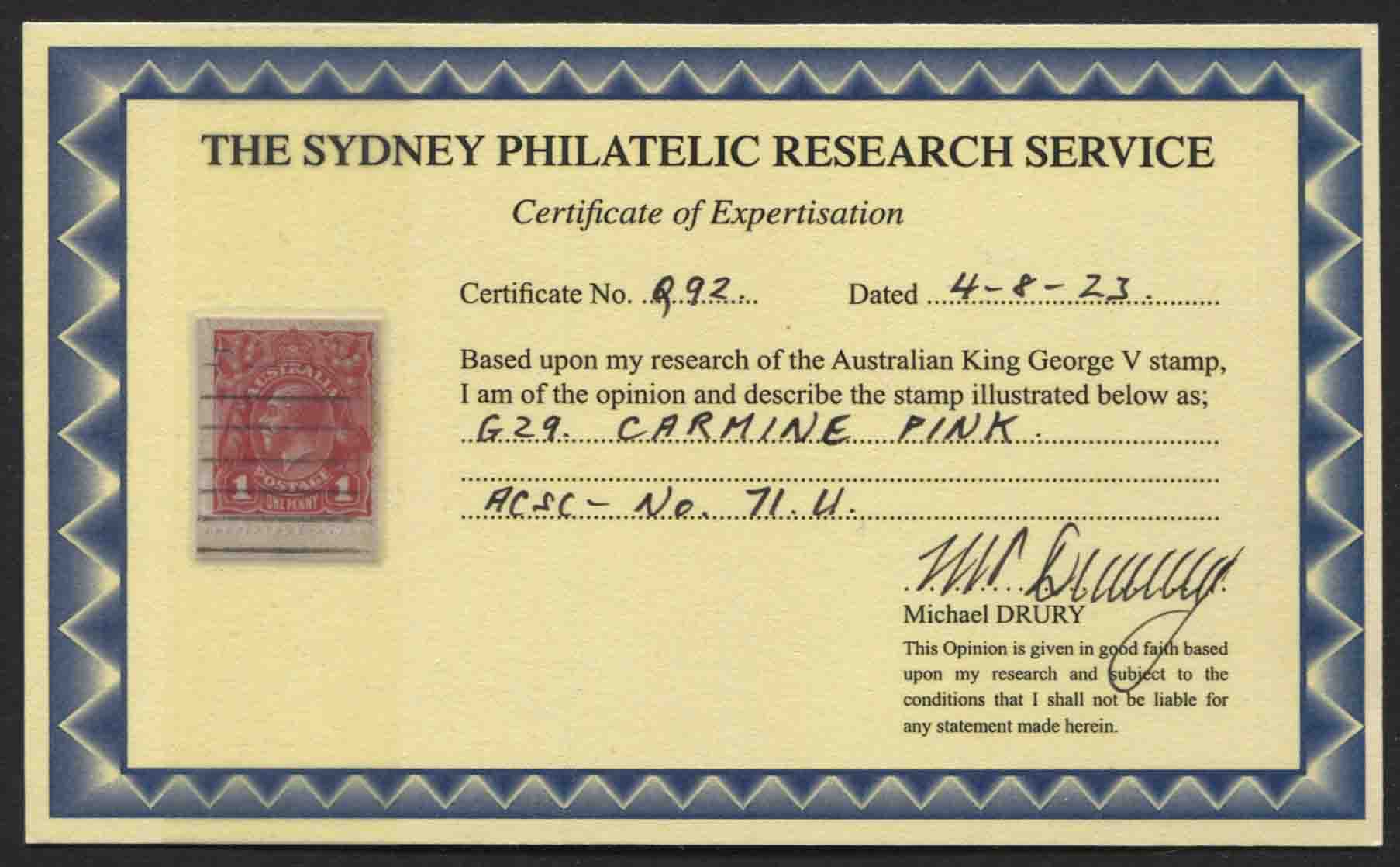 Single wmk, smooth paper. 1d CARMINE-PINK (G29) on cover. SCARCE, very fine. Drury Certificate.