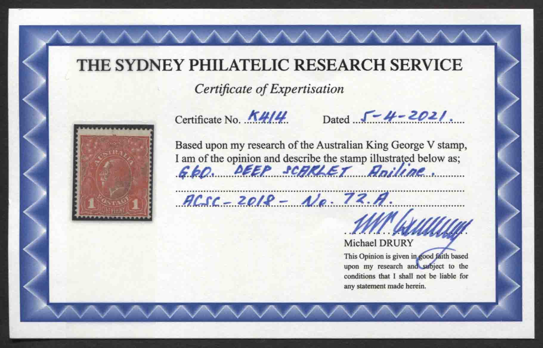 Single wmk, rough paper. 1d DEEP SCARLET Aniline (G60). DRURY CERTIFICATE. Fresh, mint unhinged.