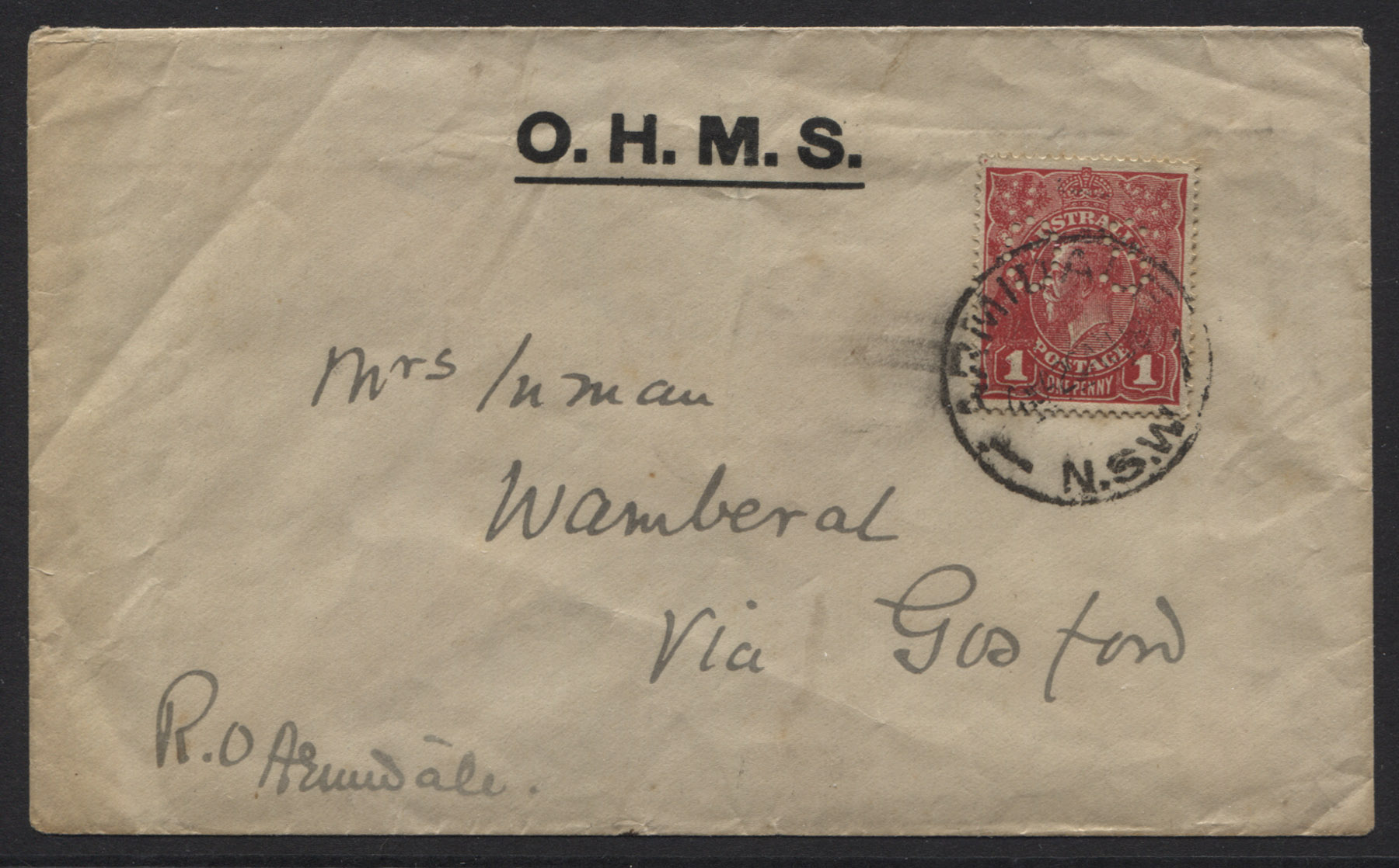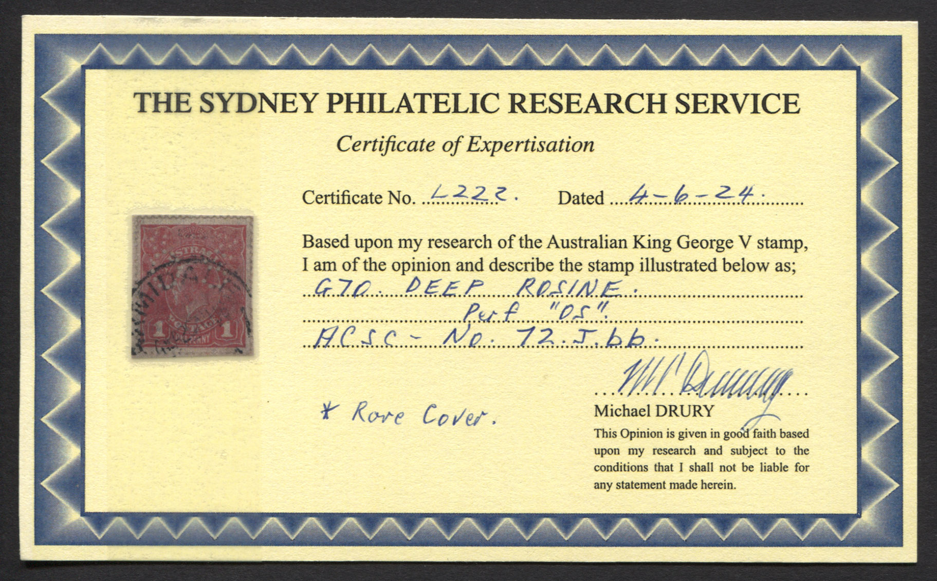 Single wmk, rough paper. 1d DEEP ROSINE, OS, tied to OHMS cover. Drury Certificate. Fine.