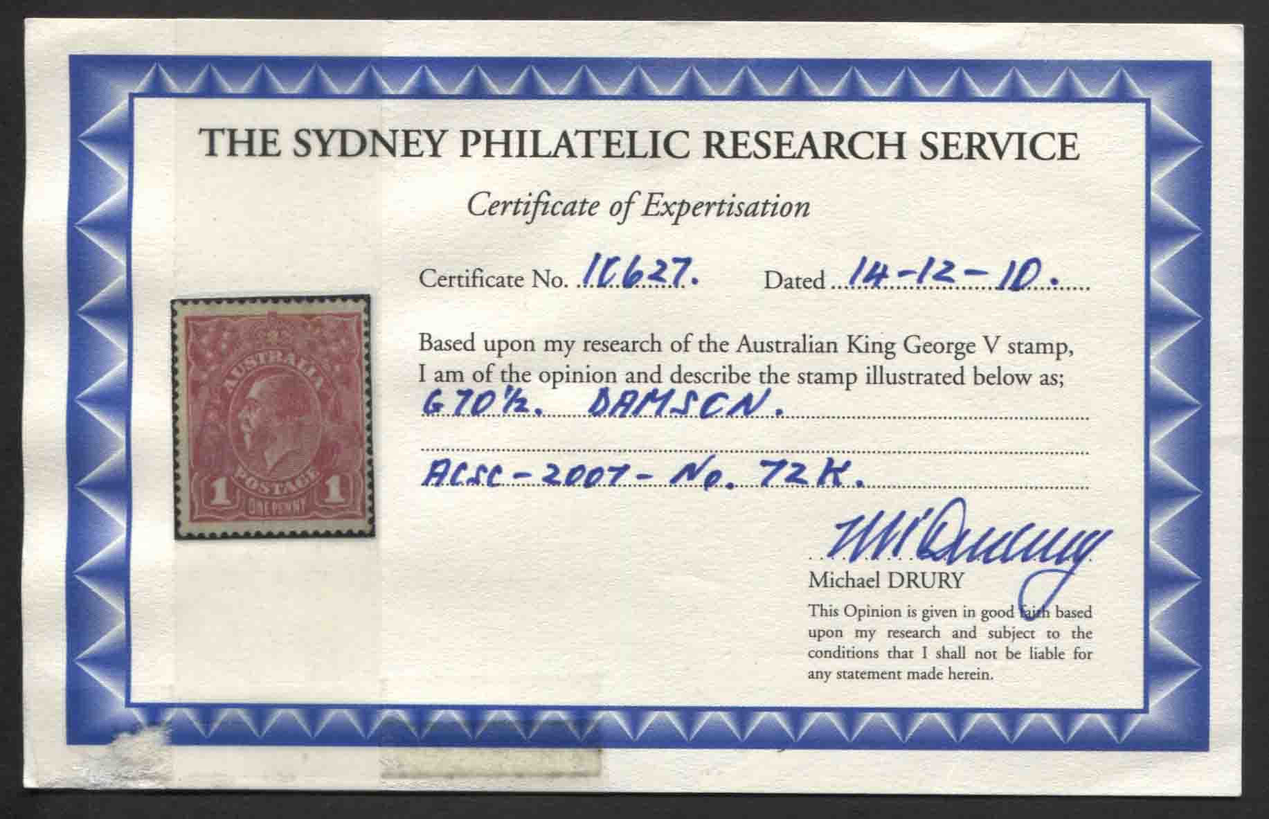 Single wmk, rough paper. 1d DAMSON (G70½). DRURY Certificate. A very scarce shade. Mint hinged.