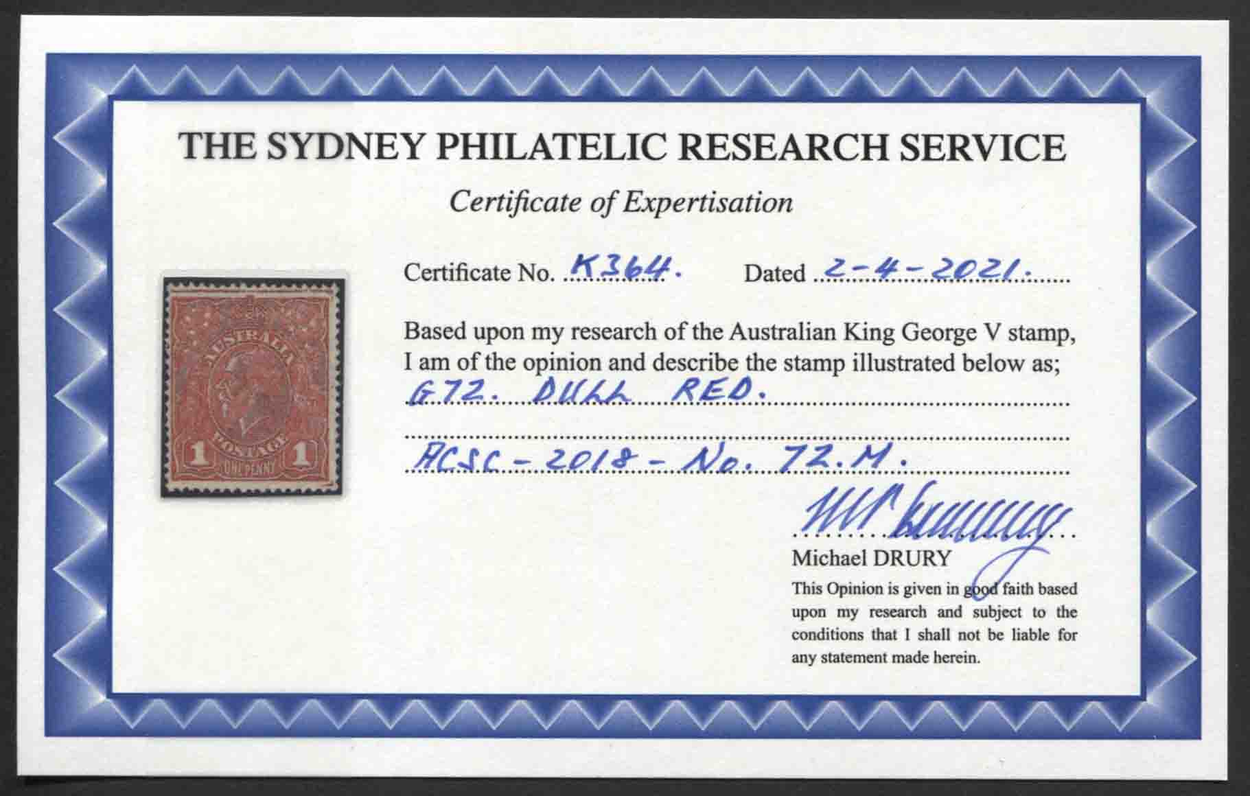 Single wmk, rough paper. 1d DULL RED (G72). Drury Certificate.