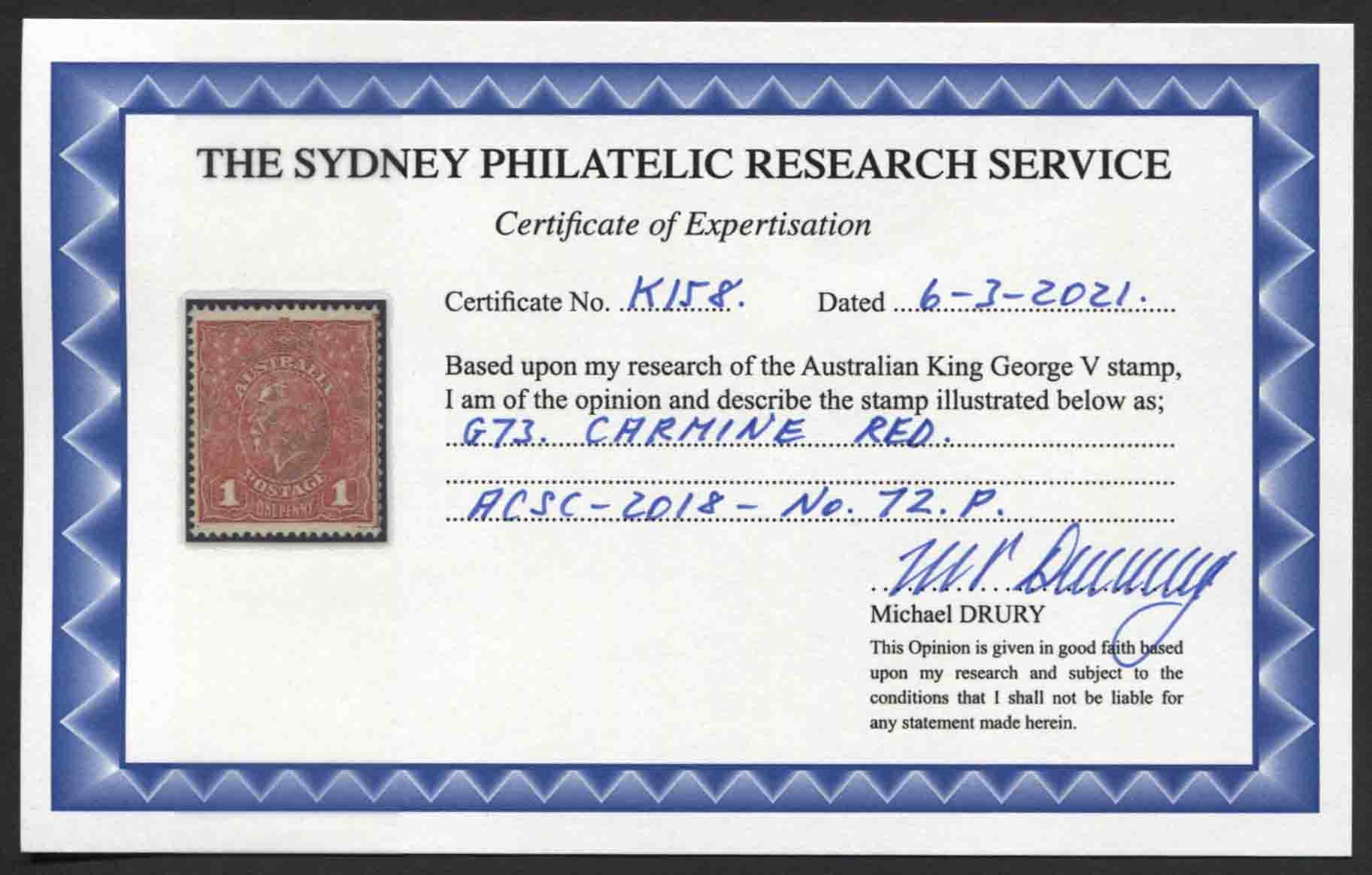 Single wmk, rough paper. 1d CARMINE-RED (G73). Drury Certificate. Extra fine,