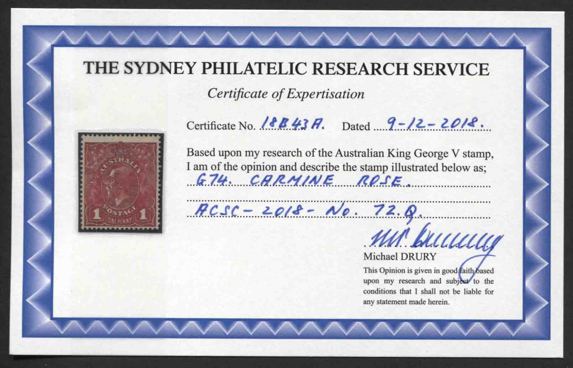 Single wmk, rough paper. 1d CARMINE-ROSE (G74). Drury Certificate.