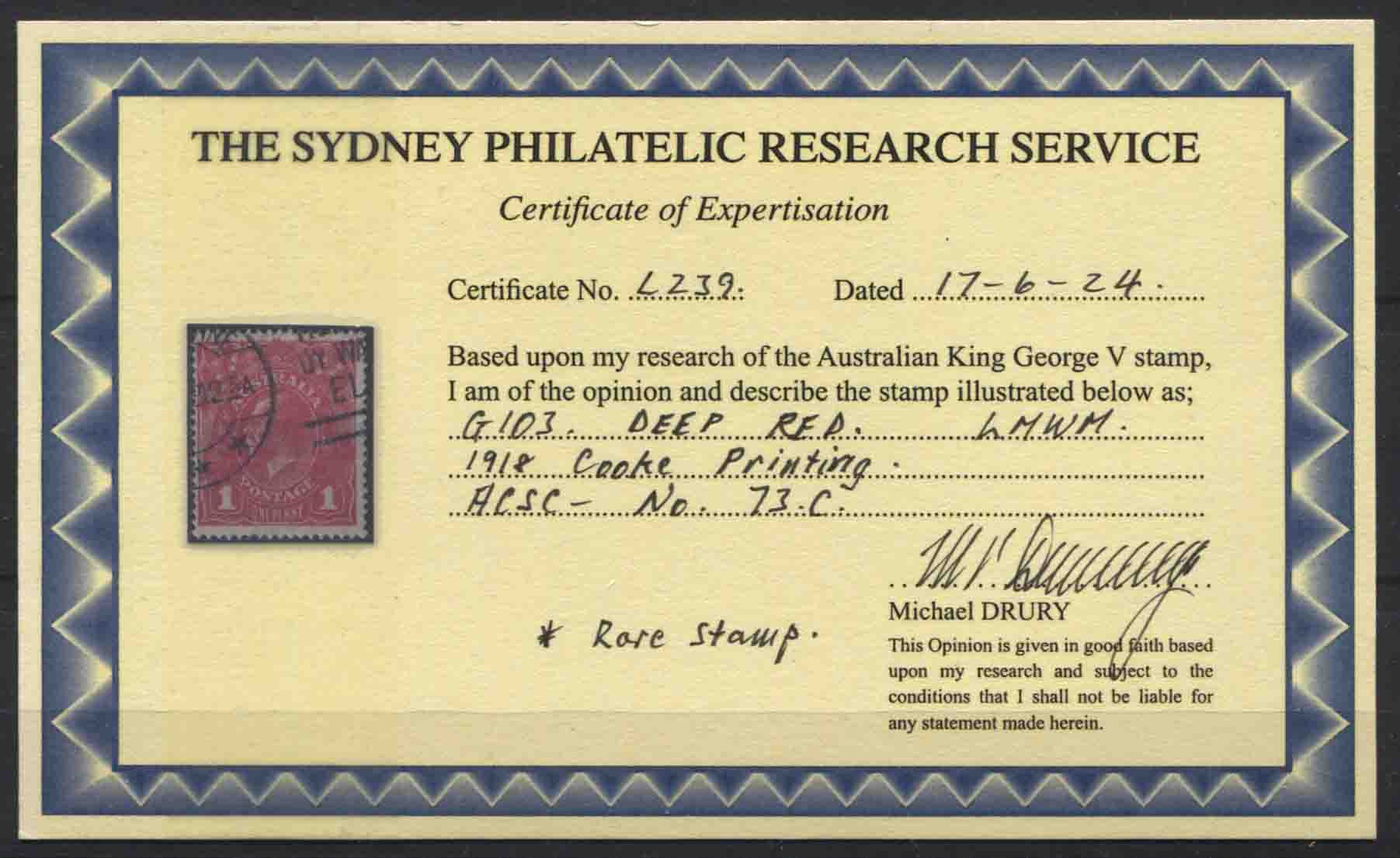 Large multiple wmk, 1d DEEP RED (G103, Cooke printing). DRURY Certificate. A VERY RARE SHADE. Fine used.