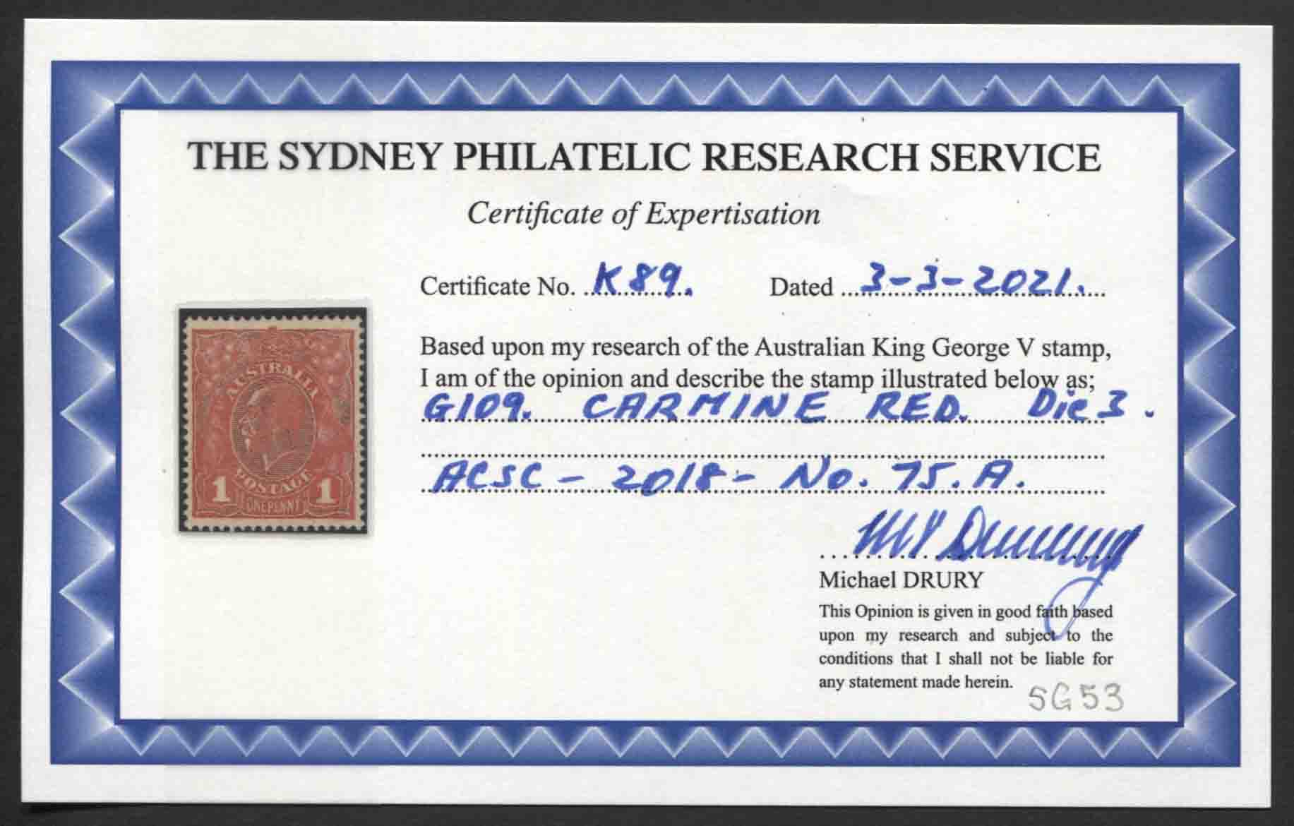 Single wmk, rough paper. 1d CARMINE-RED (G109), DIE 3. Drury Certificate. Extra fine, mint unhinged.