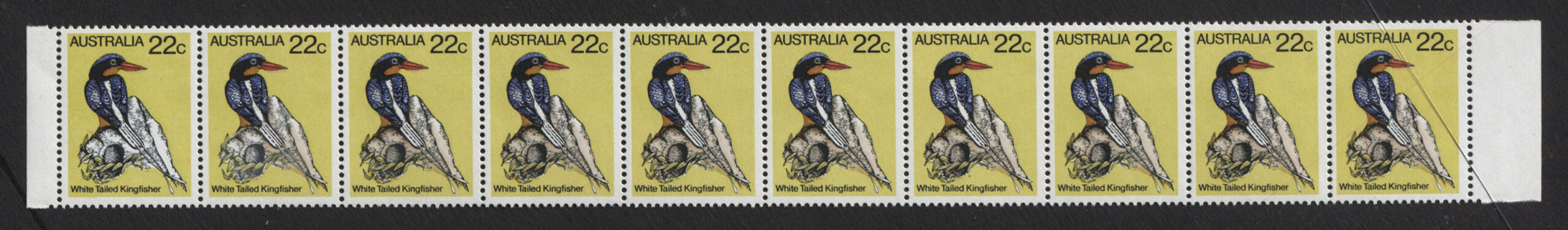 A horizontal strip of 10, first stamp BROWN (mound) totally omitted, the second stamp has partial omission. A recent discovery with only 10 strips known. Mint unhinged.