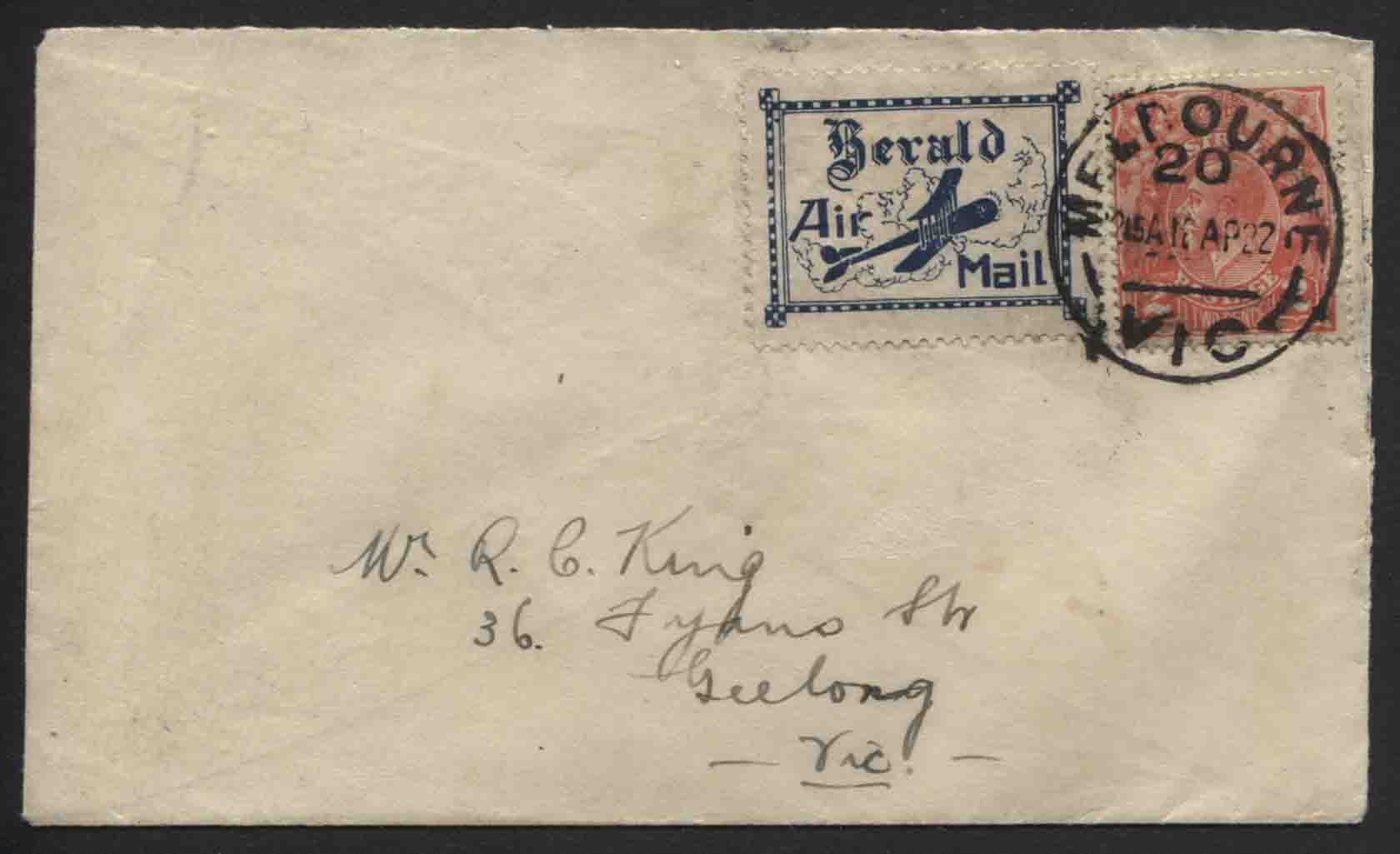 Carried on flight commemorating “Back to Geelong” celebrations. Tied by appropriately coloured (blue and white) HERALD label.