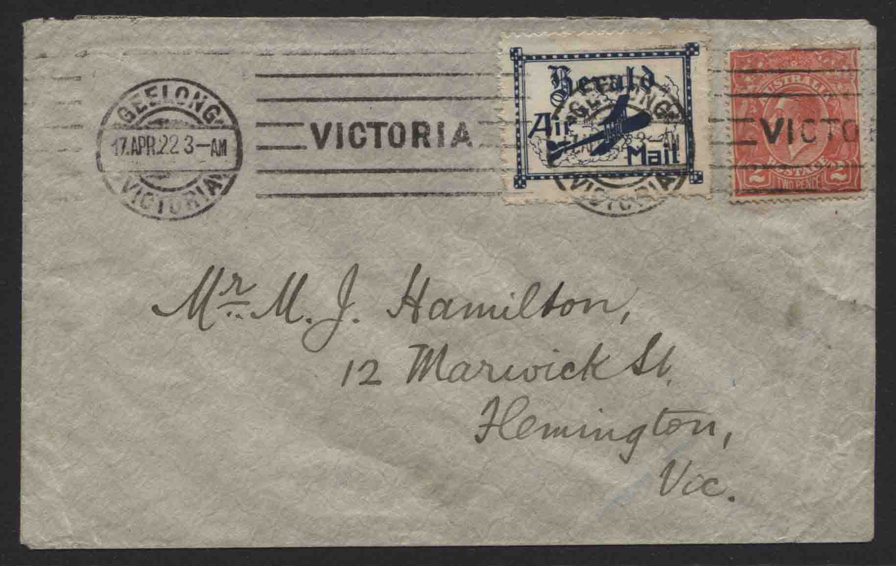 Mail carrying flight commemorating “Back to Geelong” celebrations, with HERALD AIRMAIL label attached. Overall, in fine condition.