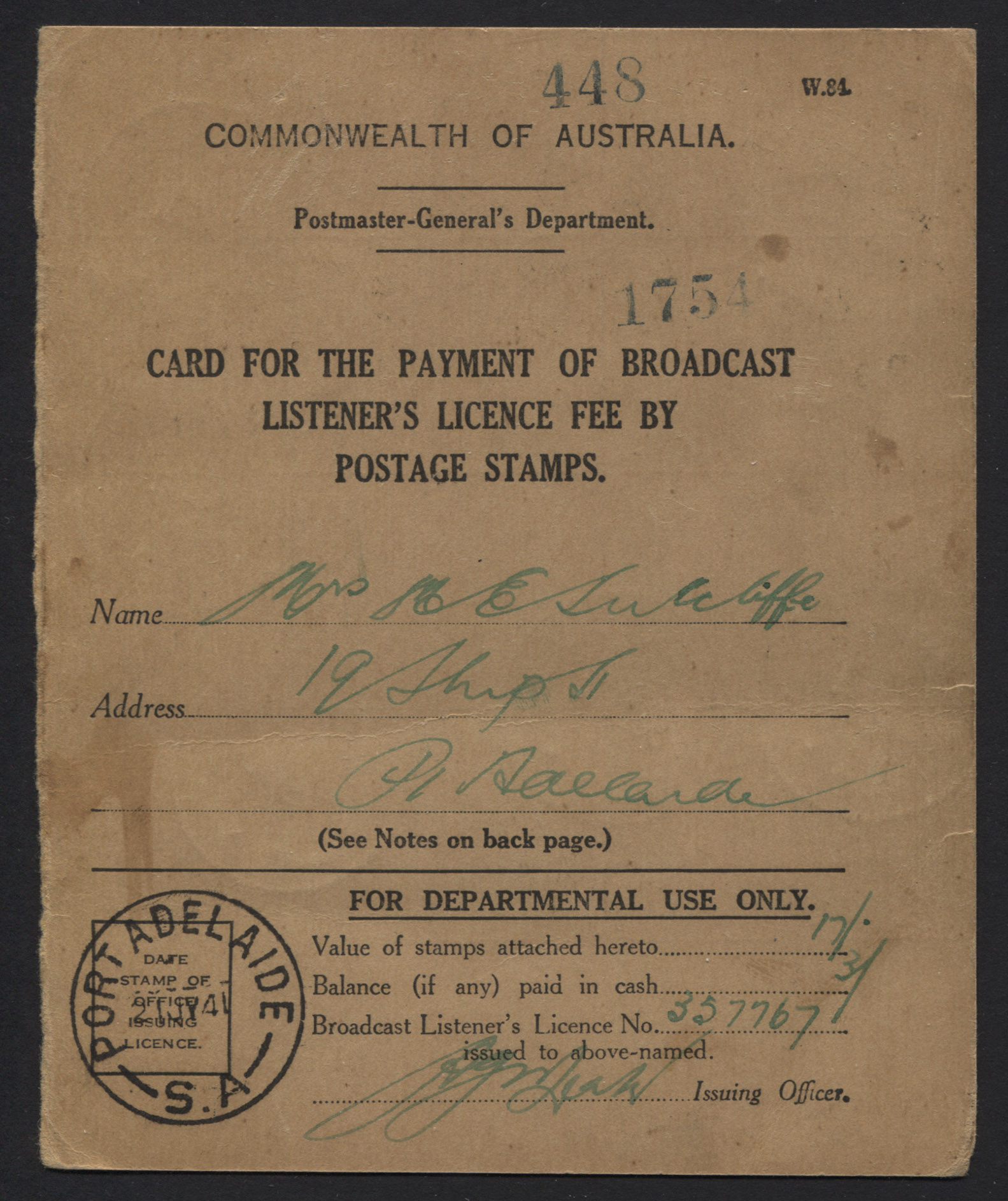 Licence fee, PAID by POSTAGE STAMPS.