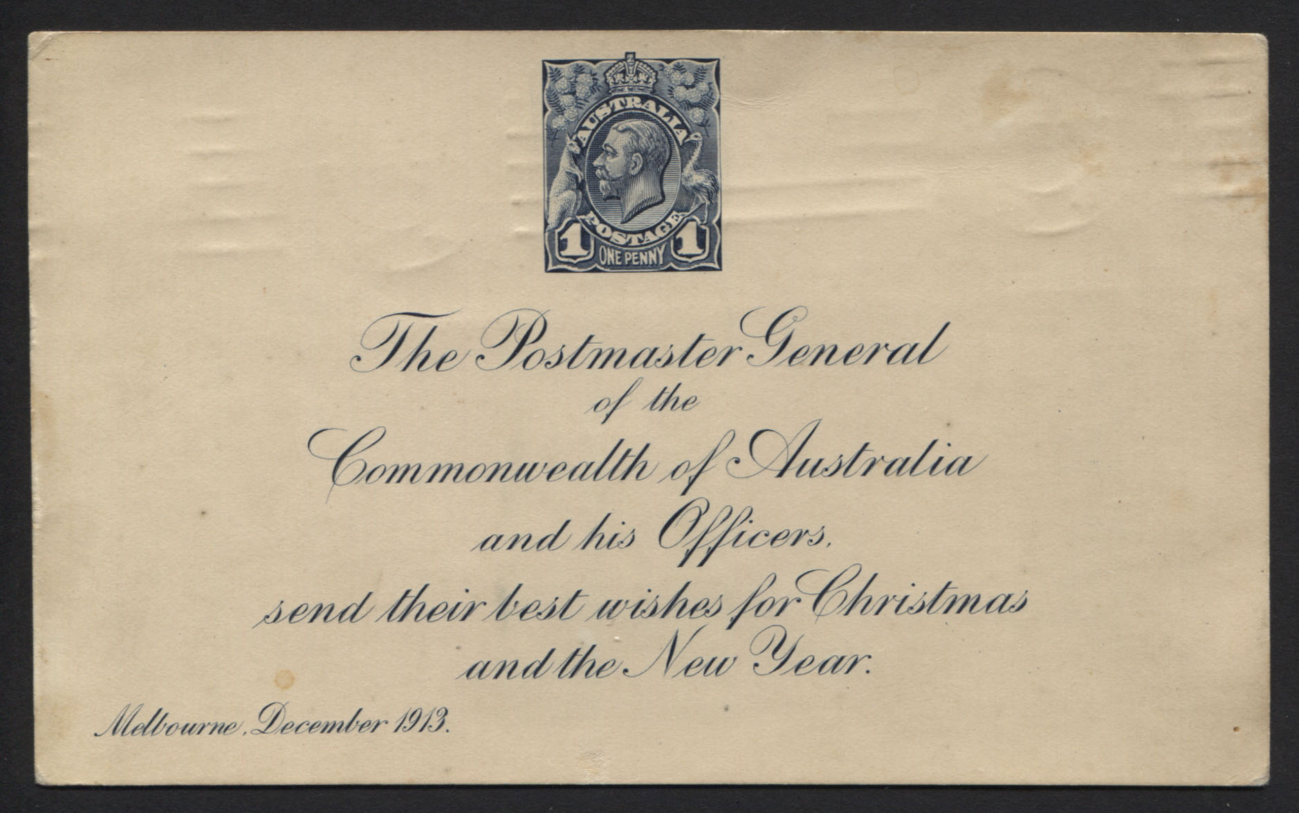 CHRISTMAS and NEW YEAR GREETING CARD. 660 cards were printed, 400 were forwarded to Treasury by T.S. Harrison. ACSC states 12-15 cards have survived. (CAT value $7,500).