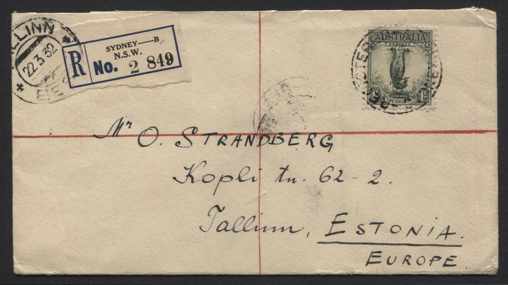 1/- lyrebird, cancelled 15/2/1932. Addressed to ESTONIA. Crinkled corner, otherwise fine.