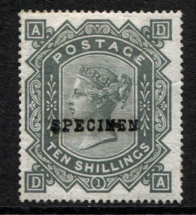 1867 10/- grey-green, Maltese Cross Wmk. Fine mint overprinted SPECIMEN, a lovely example. (Normal unoverprinted, SG catalogue value £60,000).