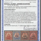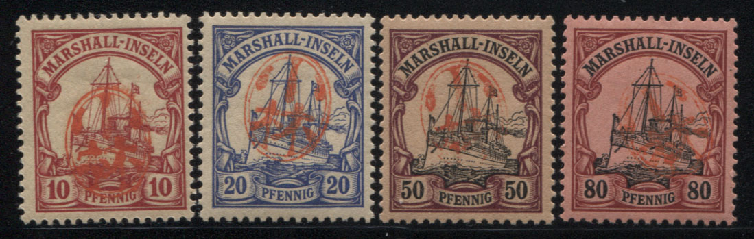 1914 red seal overprints of Paymaster K. TAMURA on 3pf, 5pf, 25pf and 30pf. Ceremuga Certificate. Fresh, mint lightly hinged.