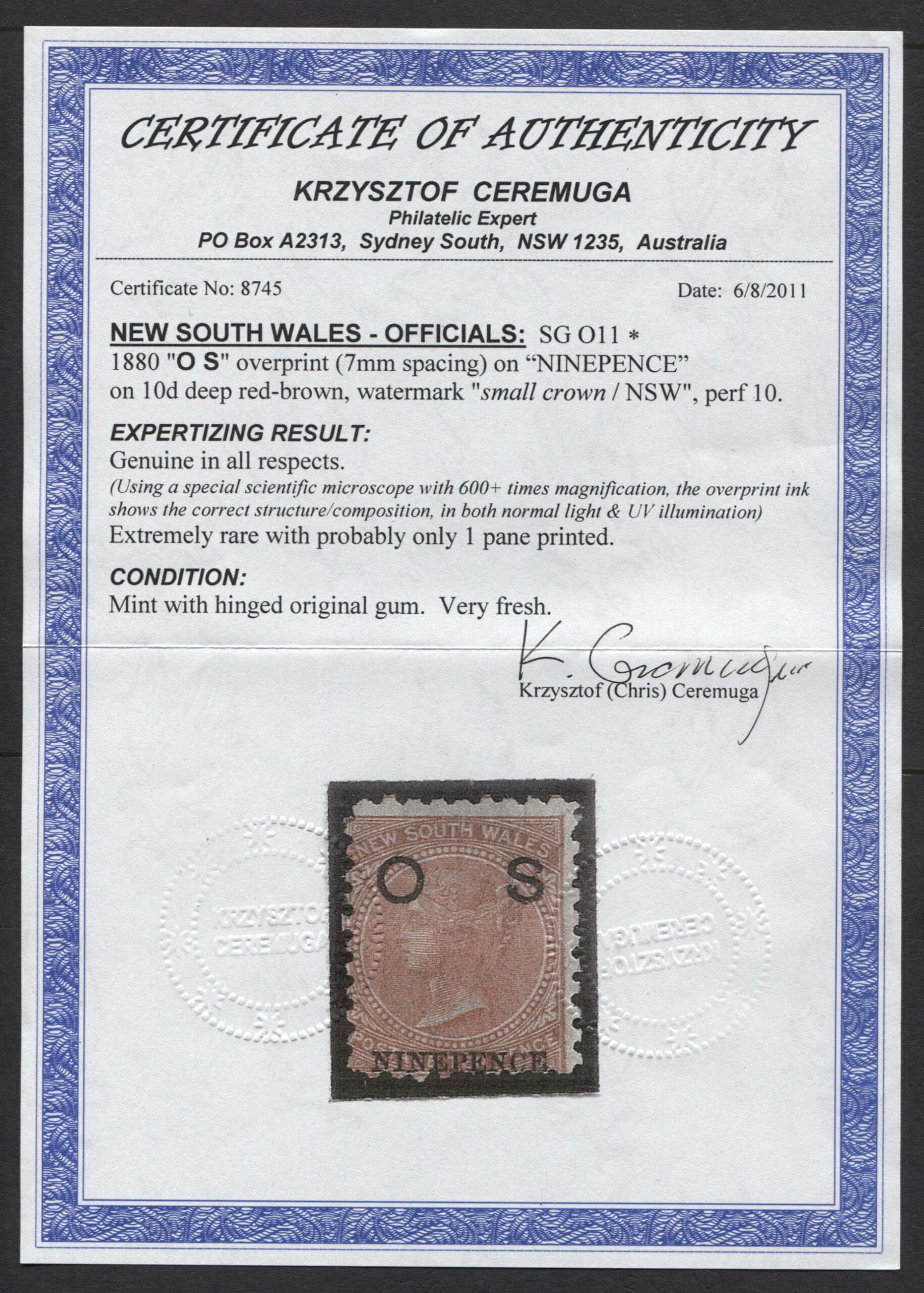 9d on 10d brown, OS overprint, perf 10. Ceremuga Certificate. Fresh, mint hinged. VERY SCARCE.