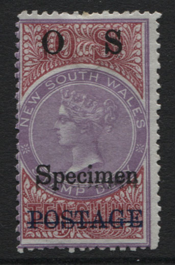 10/- mauve and claret, OS overprinted ‘Specimen’. Very fine, unused (no gum). Pristine fresh.
