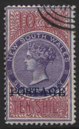 10/- mauve and claret, POSTAGE overprinted in blue, p 12 x 12. Cancelled to order.