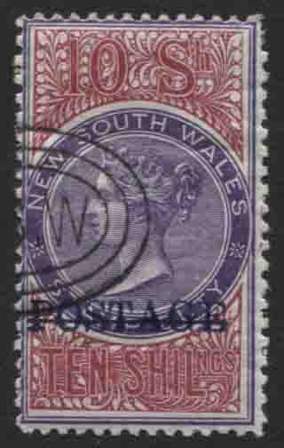 10/- mauve and claret, POSTAGE overprinted in blue, p 12 x 11. Cancelled to order.