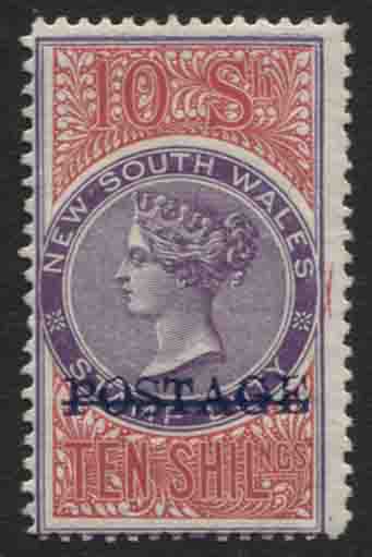 10/- violet and aniline crimson, POSTAGE overprint in blue, perf 12 x 11 chalk surfaced paper. Fine mint hinged.