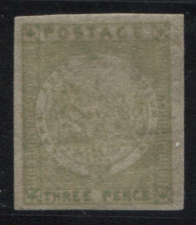 3d yellow-green on thick greyish/bluish wove paper, consistent with the later 1852 printings, position 7. Unused, without gum, 4 large margins, slightly blurred intermediate impression. Faint horizontal crease. A scarce stamp. (SG Cat £18,000).
