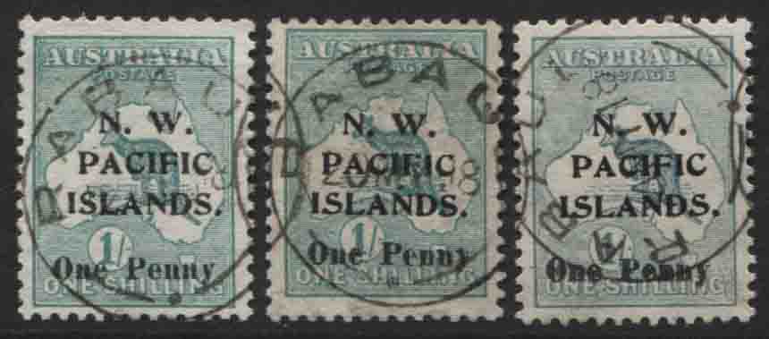ONE PENNY on 1/- green, types A, B and C (3 stamps). Fine used.