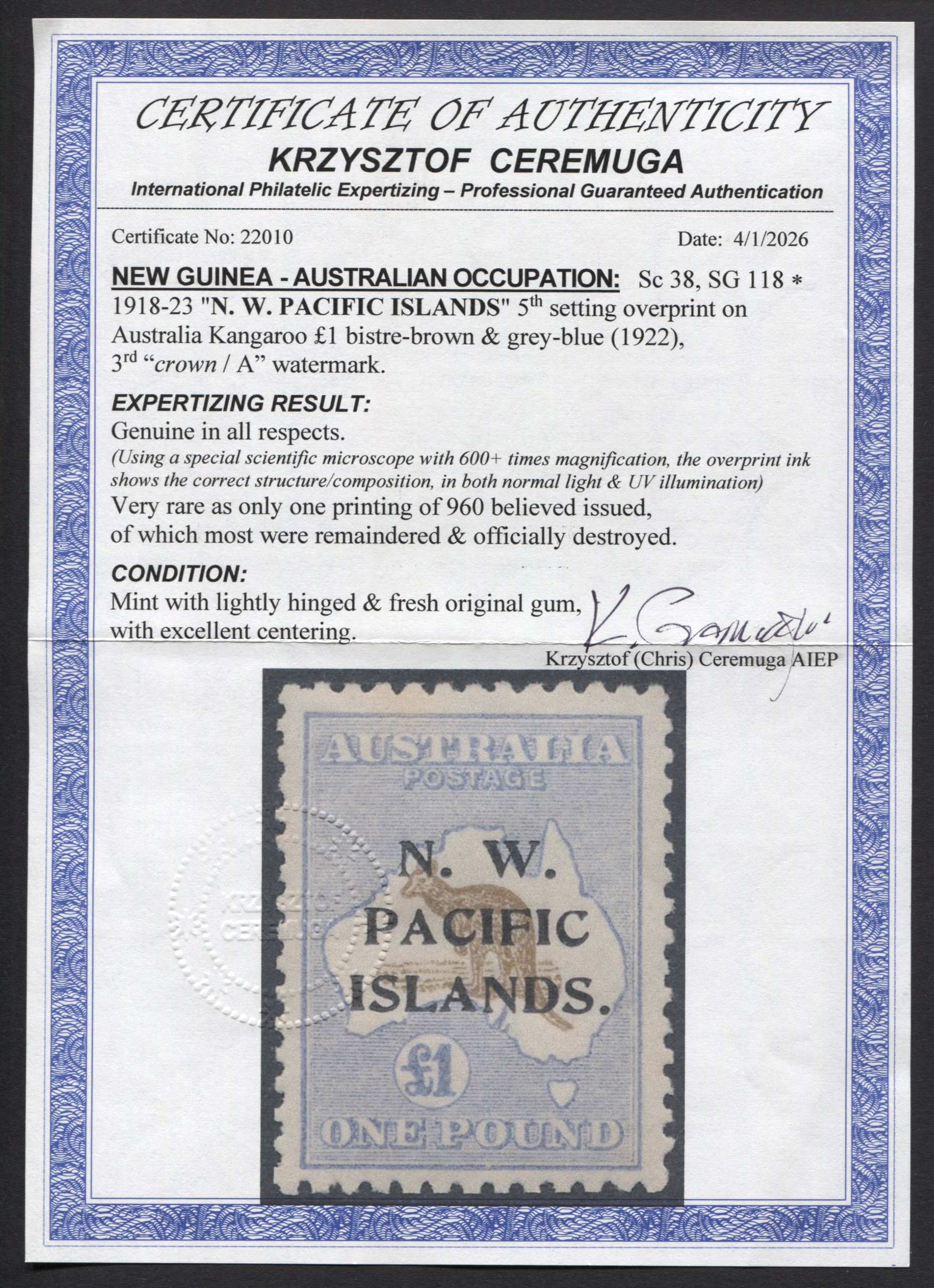 £1 bistre-brown and grey-blue, 5th setting. Ceremuga Certificate. VERY RARE, in fresh mint lightly hinged condition. Excellent colours for this issue.