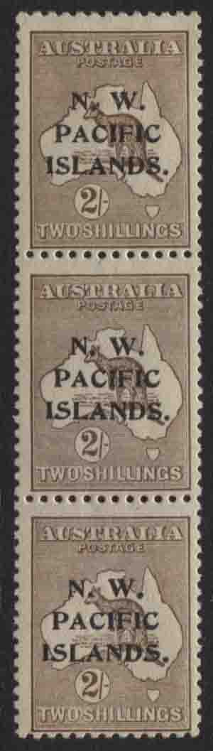 2/- brown, wmk INVERTED. Types A, B, C, strip of 3. Mint hinged.