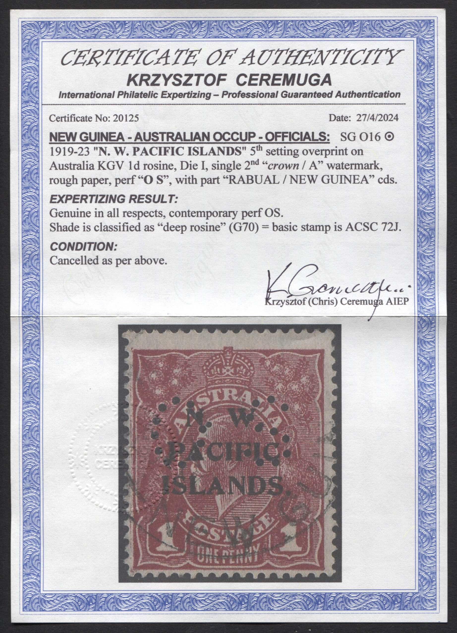 1d rosine, OS, die 1. Ceremuga Certificate. Very fine, used.