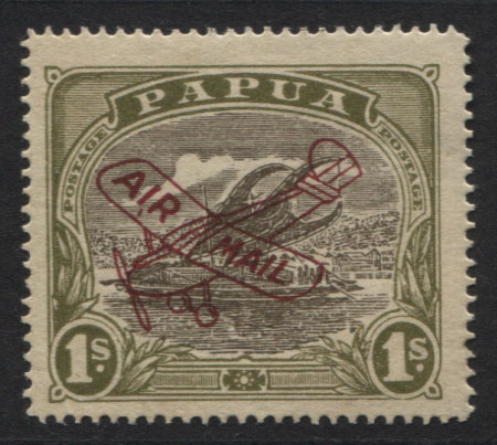 1/- AIRMAIL AIRPLANE overprint in DEEP carmine-lake. Variety: apostrophe below ‘I’ and ‘R’ of AIR. This variety only known in the DEEP carmine-lake overprint. Mint lightly hinged. Very scarce.