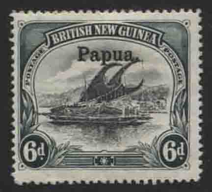 Large Papua overprint. 6d thick paper with vertical wmk. Mint lightly hinged.