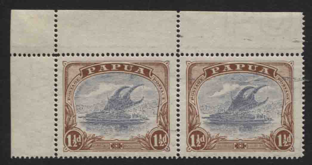 1½d cobalt and light brown, upper left corner horizontal pair. Left stamp with ‘ACE’ variety, right stamp with ‘RIFT’ variety. Both stamps are fresh, mint unhinged.