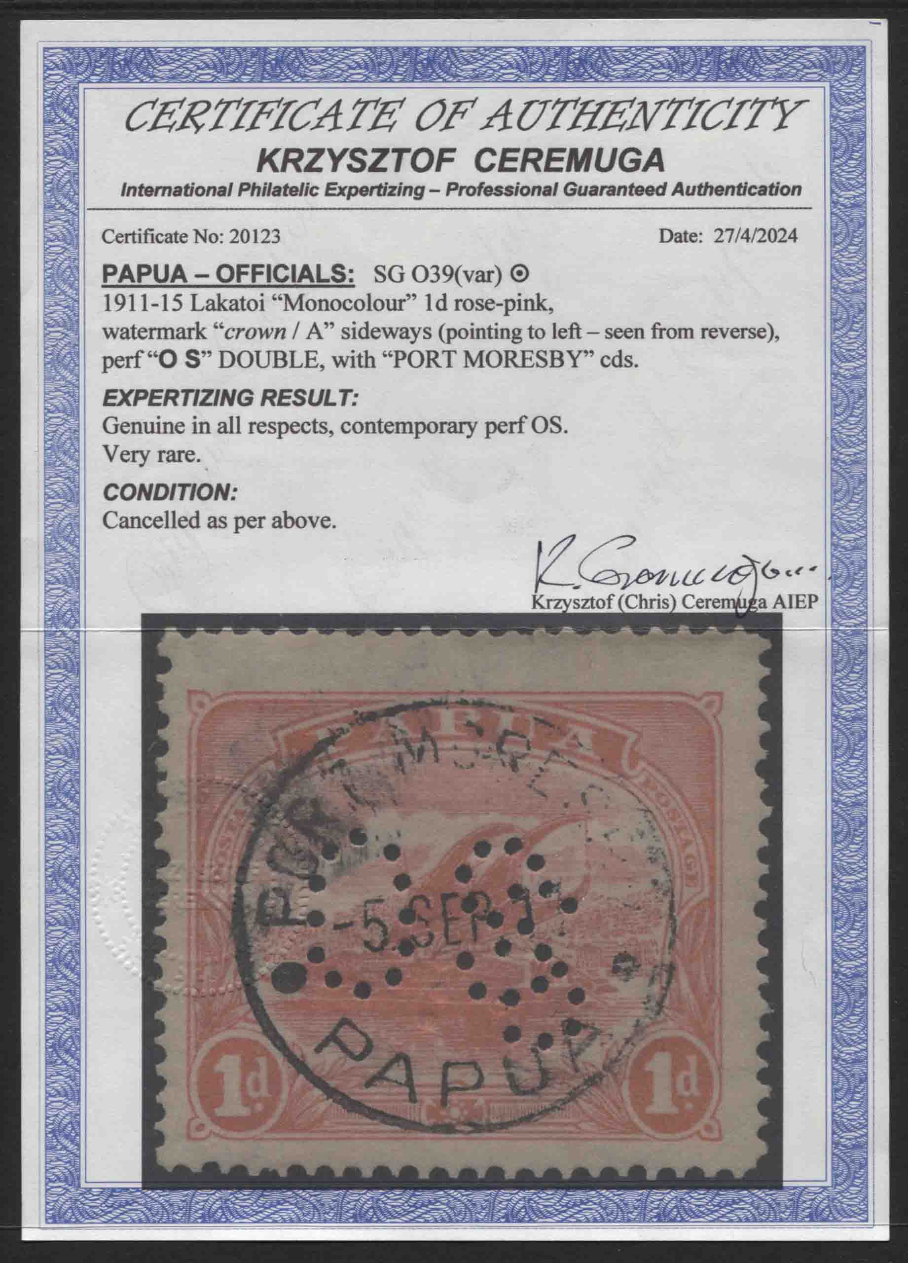 1d rose-pink with ‘OS’ DOUBLE (one O with BLIND PERFS). Ceremuga Certificate. VERY RARE. Fine used.