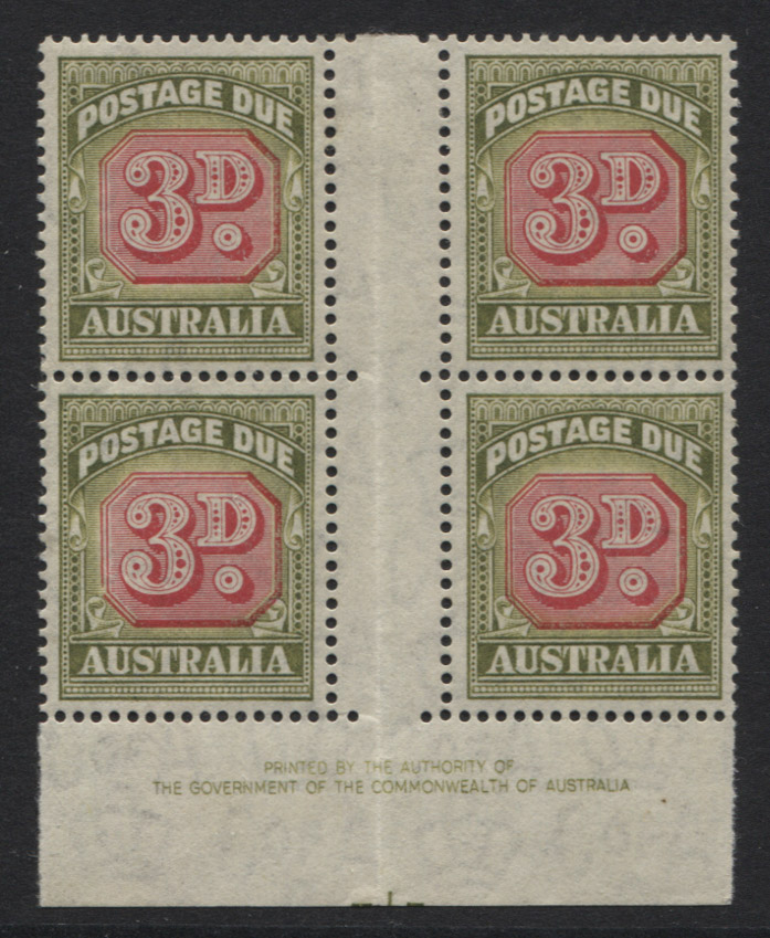 3d, redrawn, C of A wmk AUTHORITY imprint block of 4. PLATE No 1 (with dashes) at base. Very fresh, SCARCE. 2 mint lightly hinged/ 2 mint unhinged.