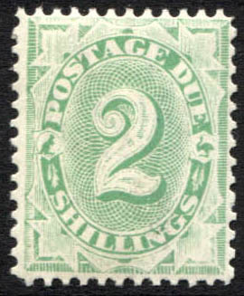 2/- emerald-green, no blank at base, perf 11½-12. Super fresh,