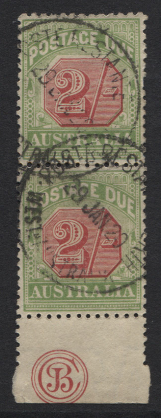 2/- JBC monogram, a vertical pair, postal usage. RARE.