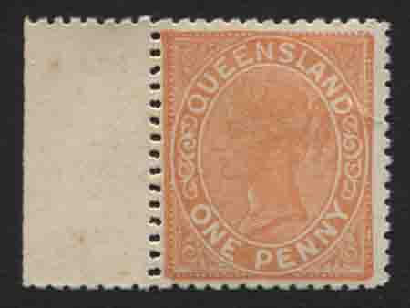 QV 1d vermilion-red, overlapping DOUBLE PERF at left. Mint unhinged.