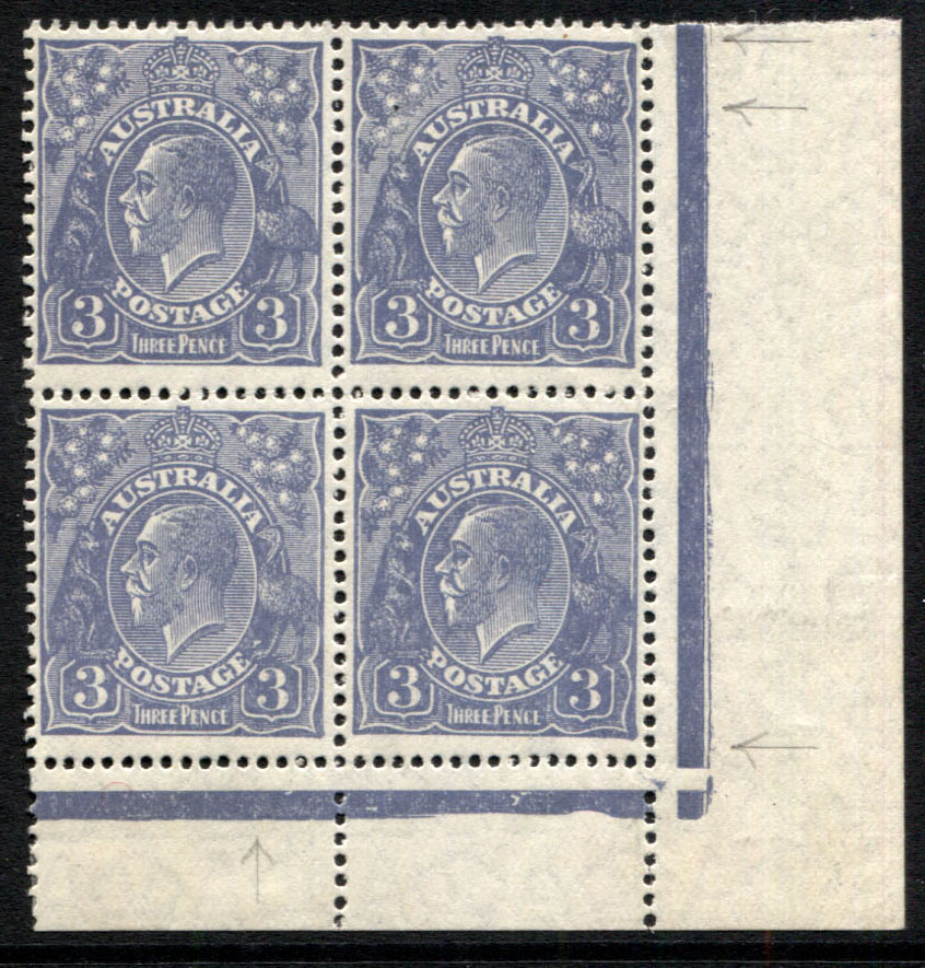 Small Multiple wmk, p13½ x 12½.3d blue DIE 1 corner block of 4. 3 units are type A, 1 unit type B. All stamps are mint unhinged.