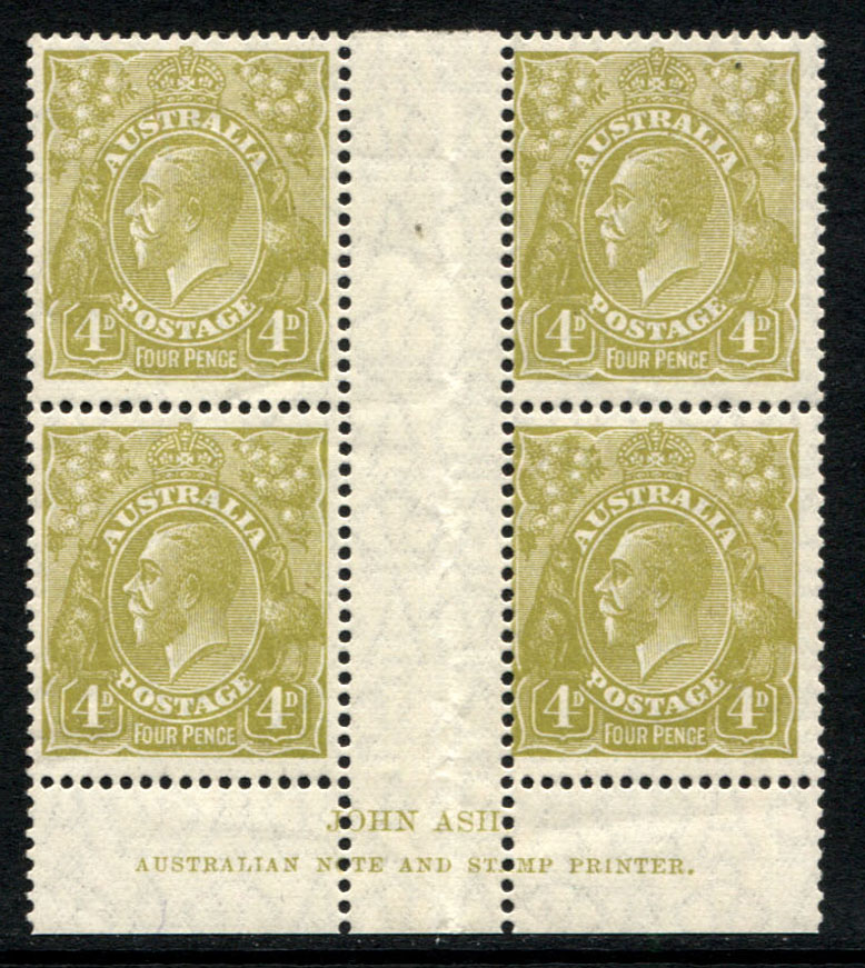 Small multiple wmk, perf 13½ x 12½. 4d olive ASH imprint block of4, PLATE 3. Upper stamps mint lightly hinged, lower row is mint unhinged. Paper inclusion reflected in pricing.