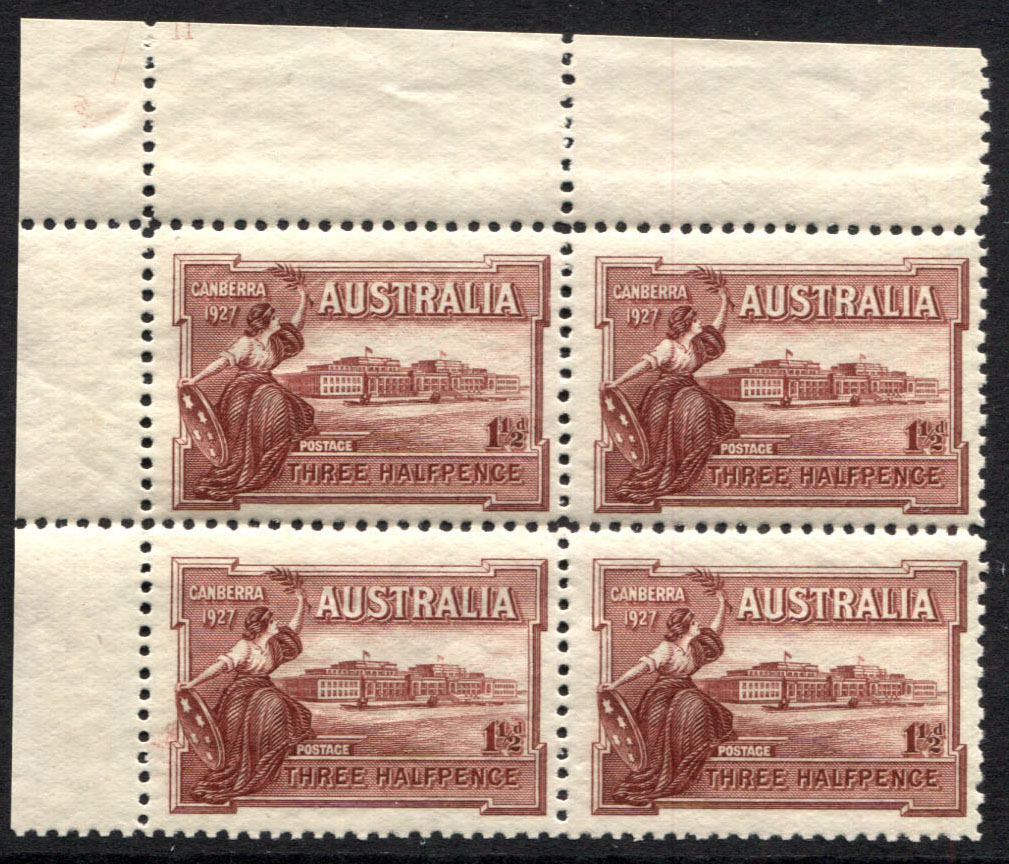 1½d Canberra PLATE NO. 11 upper left corner block of 4. Fresh and fully mint unhinged. SCARCE.
