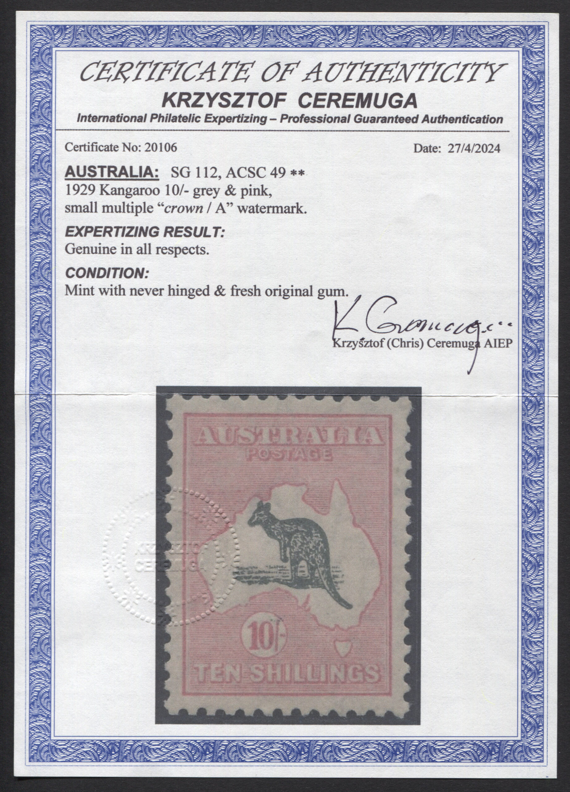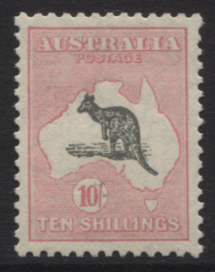 10/- grey and pink. SUPER FINE, well centred and very fresh mint unhinged. A gem! CEREMUGA Certificate.