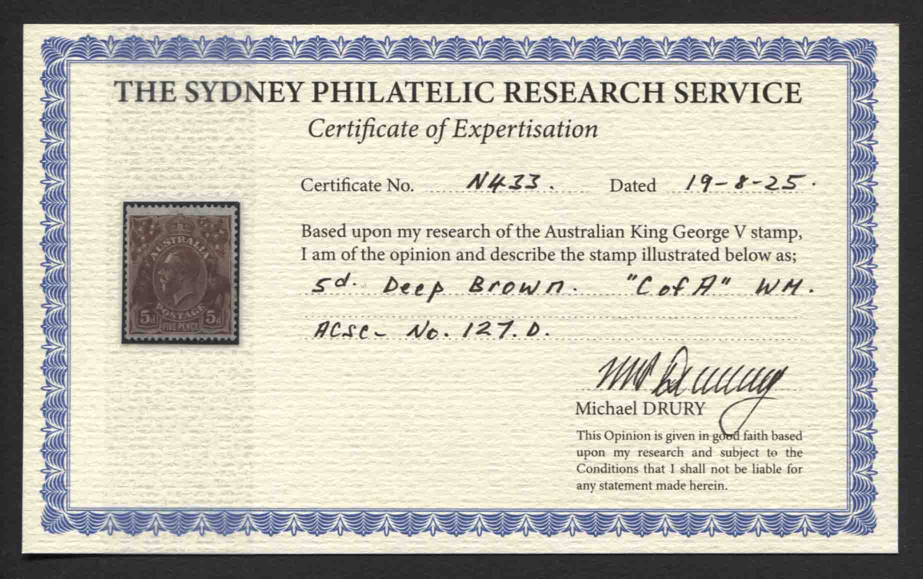 C of A wmk, 5d DEEP BROWN. DRURY Certificate.