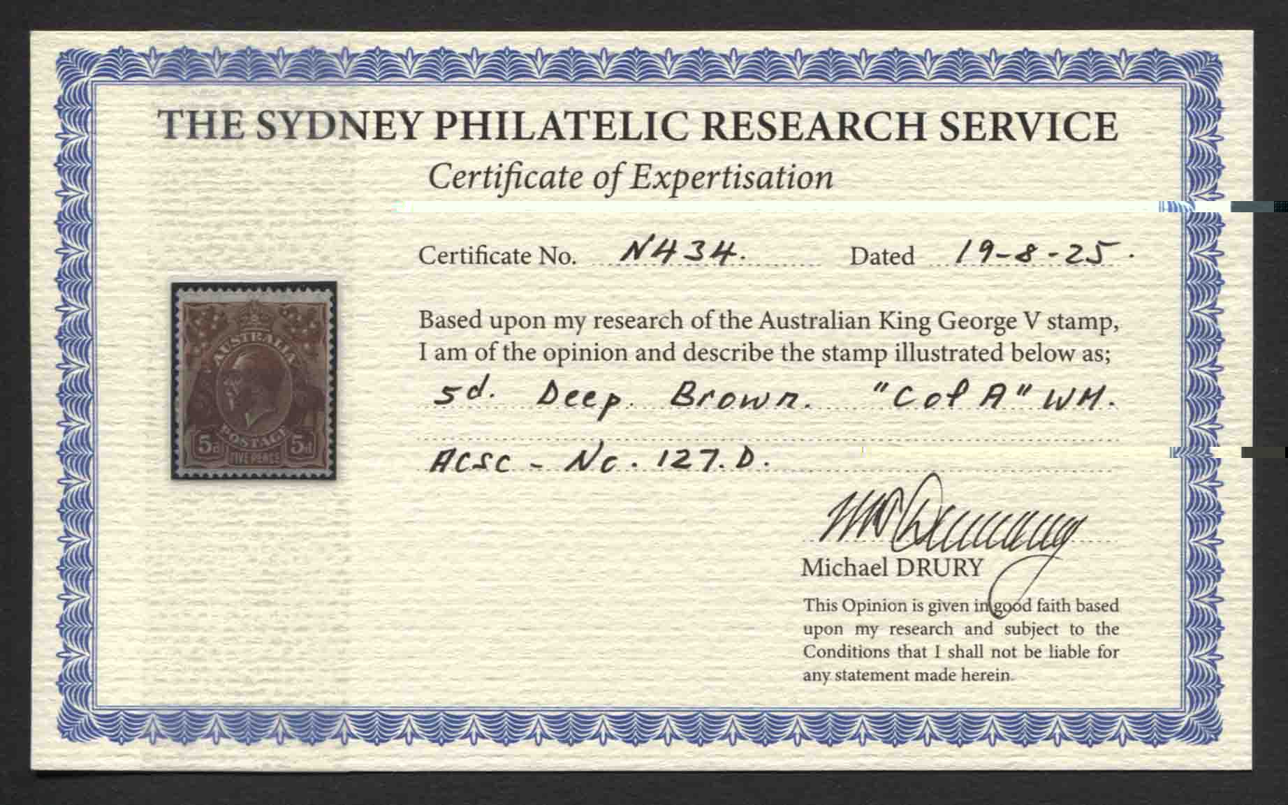 C of A wmk, 5d DEEP BROWN. DRURY Certificate.
