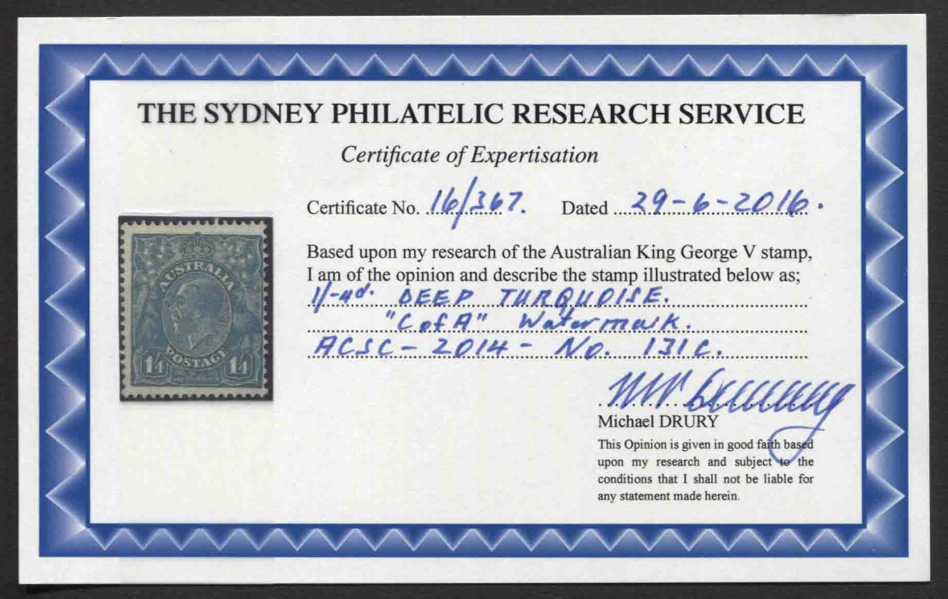 C of A wmk, 1/4 DEEP turquoise DRURY Certificate. Surprisingly not listed in SG. VERY SCARCE. Fresh, mint lightly hinged.