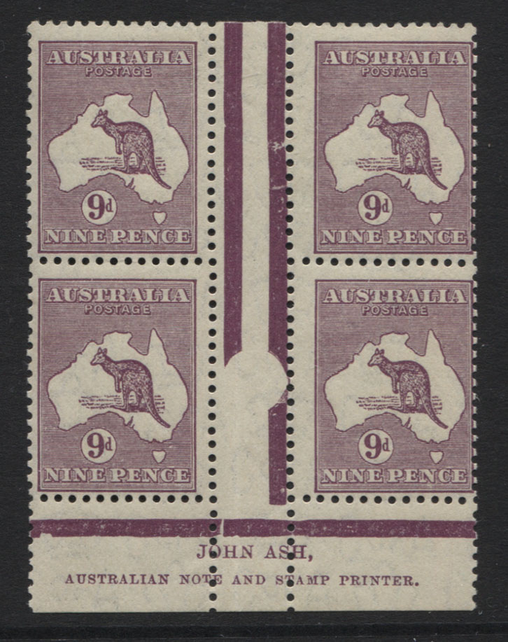 9d violet, ASH imprint block of 4, plate 3 – SECOND STATE. Extra fine, totally mint unhinged.